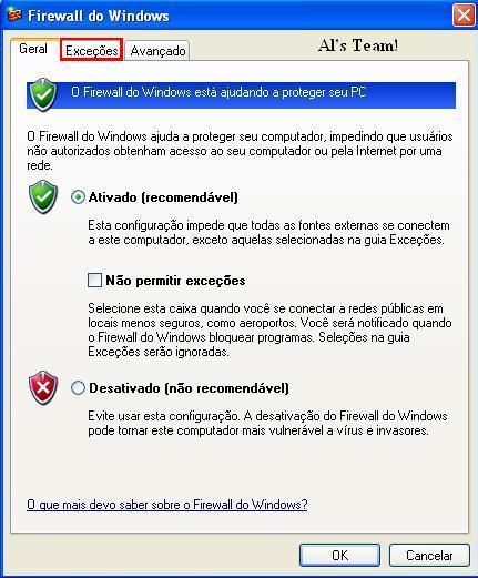 3-Depois que você abriu seu Firewall do Windows, lá em cima tem a guia Exceções, clique: